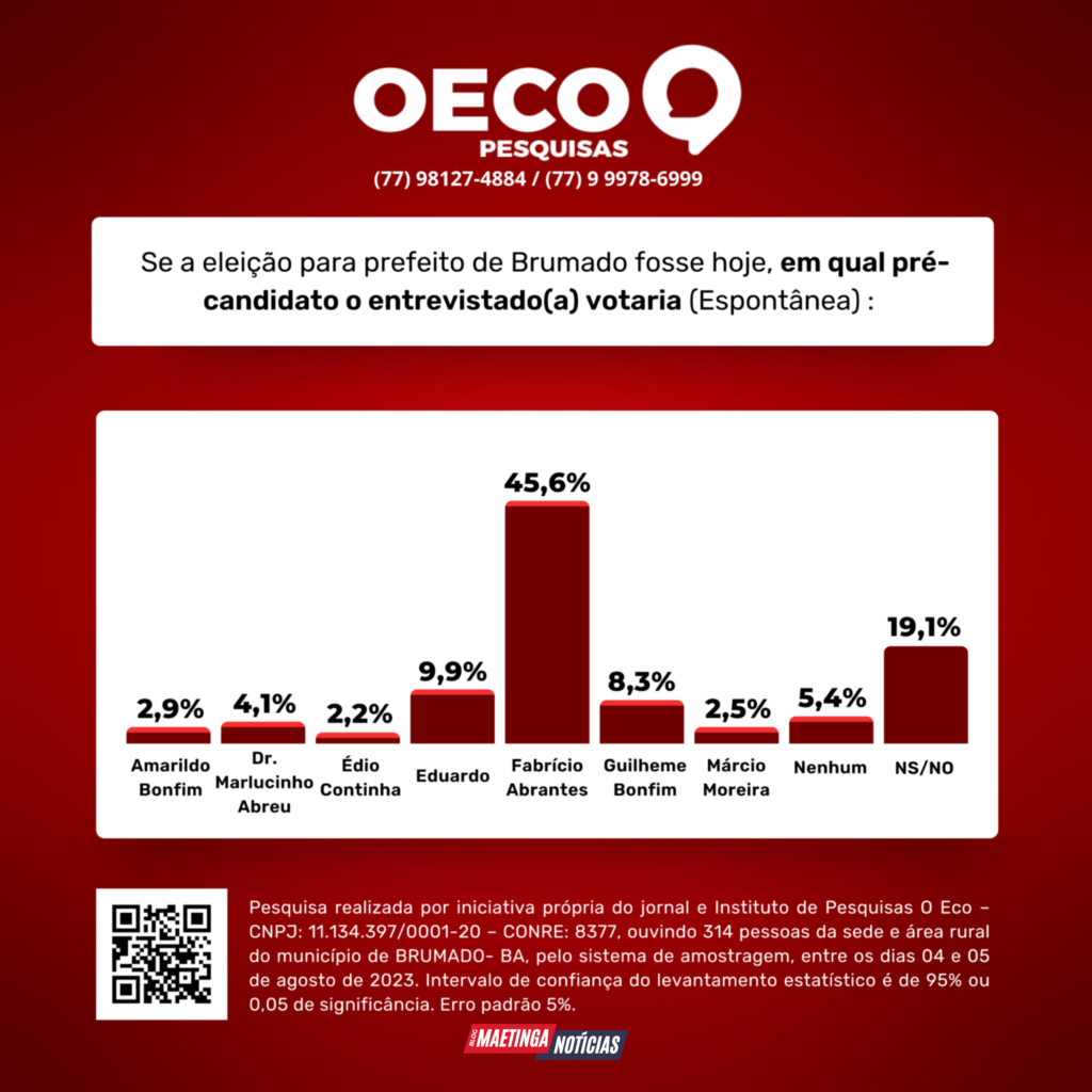 A mais recente pesquisa realizada por iniciativa própria pelo conceituado Jornal e Instituto de pesquisas O Eco, empresa que atua no mercado há 27 anos, tendo construído um invejável histórico de credibilidade nos seus prognósticos realizados, especialmente nos períodos eleitorais, indica que em Brumado, enquanto se amplia a pré-candidatura do empresário Fabrício Abrantes, os demais nomes, potenciais pré-candidatos não conseguem avançar na preferência do eleitorado, pelo menos nesse momento, há praticamente 1 ano e 1 mês da disputa pela sucessão municipal. Segundo revelou o levantamento, que ouviu eleitores da sede e área rural do município, o crescimento de Fabrício é explícito tanto na cidade quanto nas comunidades rurais, que reclamam a ausência da atual gestão. 41,4% dos entrevistados desaprovam o governo municipal classificando como ruim ou péssimo, enquanto apenas 23,9% classificam a administração como ótima ou boa.