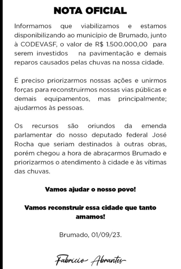 AJUDA PARA BRUMADO! Na manhã desta sexta-feira, o empresário e líder político, Fabrício Abrantes anunciou que viabilizou e está disponibilizando ao município de Brumado a quantia de R$ 1.500.000,00 para serem investidos na pavimentação e demais reparos causados pelas recentes chuvas que assolaram a cidade.