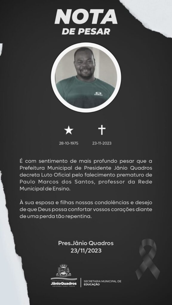 Na noite desta quinta-feira (23), faleceu Paulo Marcos dos Santos, professor da Rede Municipal de Ensino de Presidente Jânio Quadros.