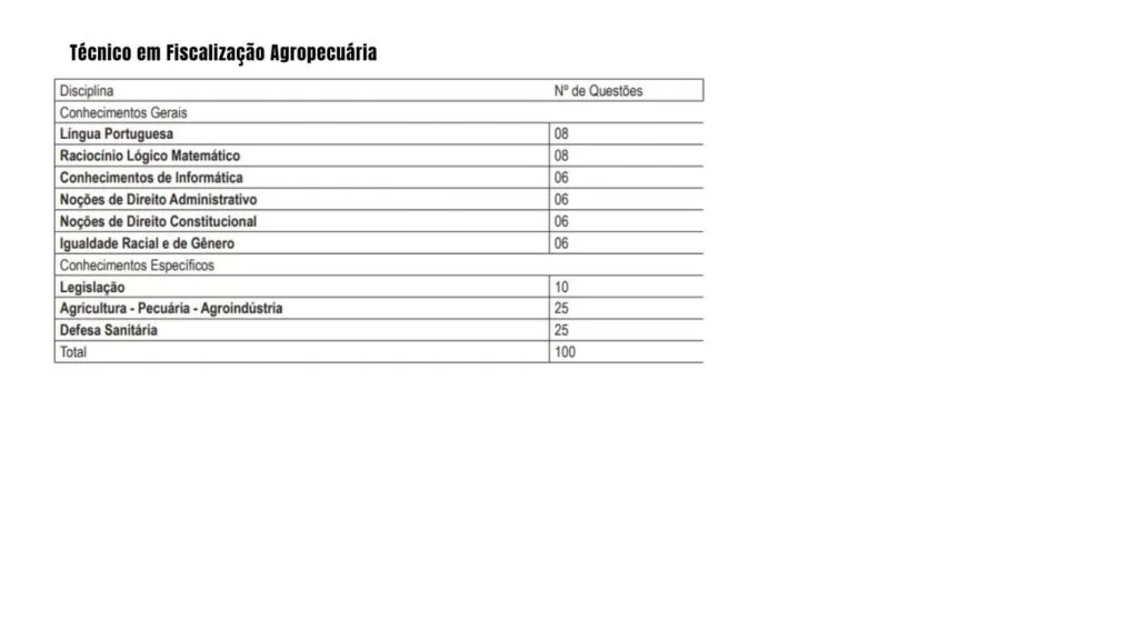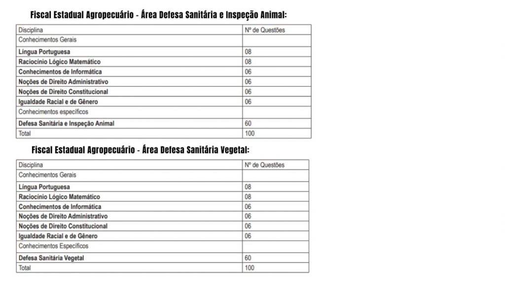 Para os cargos de FEA, a área de atuação é em Defesa Sanitária e Inspeção Animal, e Defesa Sanitária Vegetal, com carga horária de 40 horas semanais. A remuneração de ingresso para o cargo de FEA é constituída pelo vencimento básico no valor de R$ 3.029,30 (três mil e vinte e nove reais e trinta centavos), acrescido de Gratificação pela Atividade de Fiscalização e Defesa Agropecuária, no percentual de 115% (cento e quinze por cento) para a classe inicial, incidente sobre o vencimento básico, equivalente ao valor de R$ 3.483,70 (três mil, quatrocentos e oitenta e três reais e setenta centavos), perfazendo o total de R$ 6.513,00 (seis mil, quinhentos e treze reais). Para Técnico em Fiscalização Agropecuária a remuneração é constituída pelo vencimento básico no valor de R$ 1.320,00 (mil, trezentos e vinte reais), acrescido de Gratificação pela Atividade de Fiscalização e Defesa Agropecuária no percentual de 85% (oitenta e cinco por cento) para a classe inicial, incidente sobre o vencimento básico, equivalente a R$ 1.122,00 (mil, cento e vinte e dois reais), perfazendo o total de R$ 2.442,00 (dois mil, quatrocentos e quarenta e dois reais).