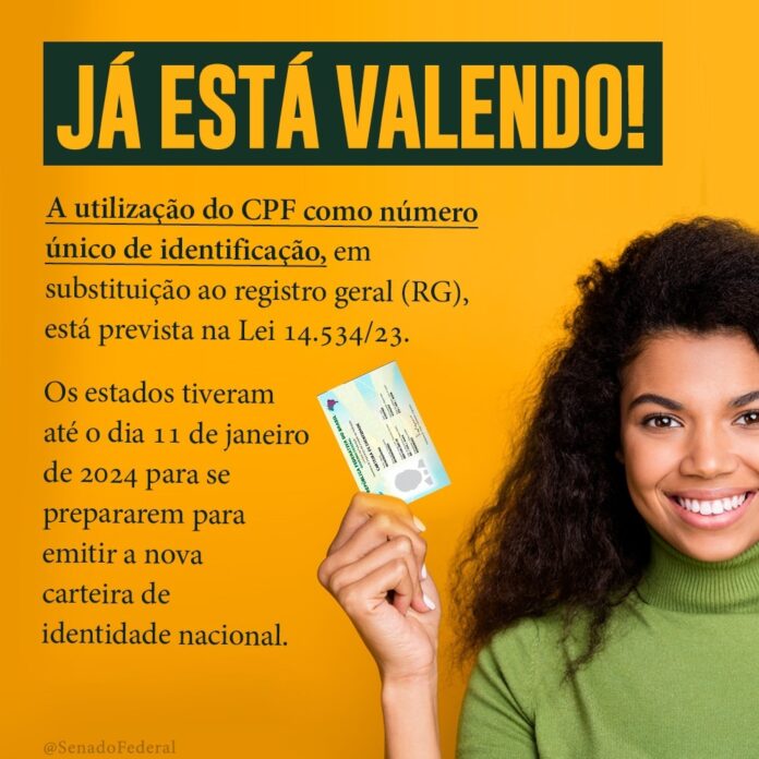 Já esta valendo a utilização do CPF como número único de identificação, em substituição ao registro geral (RG), prevista na Lei 14.534, sancionada em 11 de janeiro de 2023.