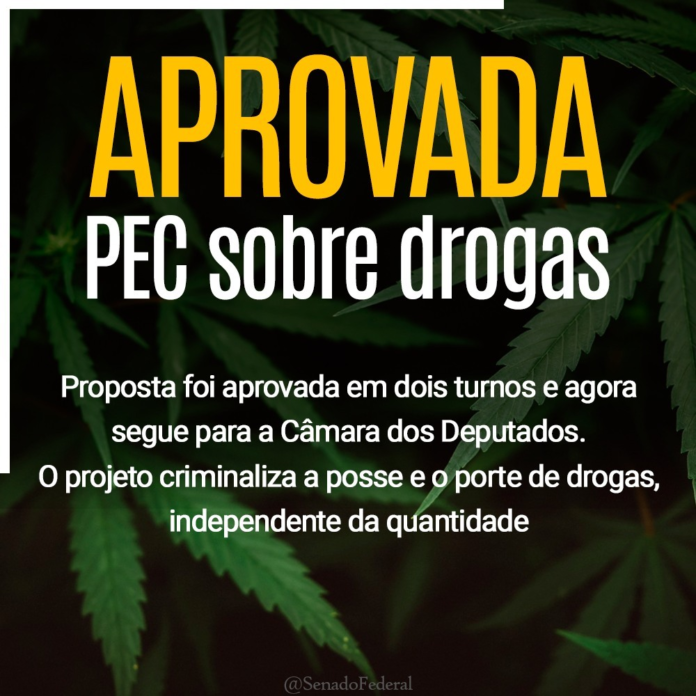 O texto aprovado insere no art. 5º da Constituição Federal a determinação de que é crime a posse ou porte de qualquer quantidade de droga ou entorpecente “sem autorização ou em desacordo com determinação legal ou regulamentar”. A PEC é de autoria do senador Rodrigo Pacheco (PSD-MG), presidente do Senado.