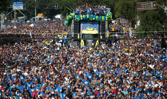 Acompanhado do apóstolo Estevam Hernandes, da Igreja Renascer em Cristo, o prefeito de São Paulo, Ricardo Nunes discursou de um carro de som. Dizendo estar feliz e emocionado, Nunes pediu orações pelas pessoas afetadas pela catástrofe climática no Rio Grande do Sul. “Que a gente possa colocar os nossos irmãos do Rio Grande do Sul em nossas orações, para que eles tenham de todos nós uma energia muito positiva”, conclamou o prefeito, que estava junto com a esposa, Regina.