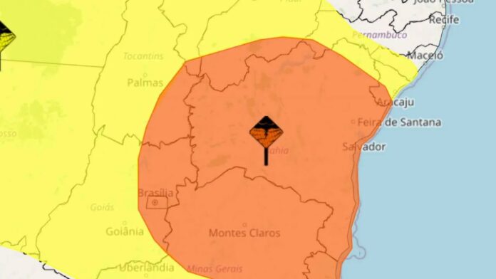 São 410 municípios em alerta laranja, de perigo potencial, onde podem ocorrer chuvas entre 30 e 60 mm/h ou 50 e 100 mm/dia, acompanhada de ventos intensos, com rajadas de 60 a 100 km/h.
