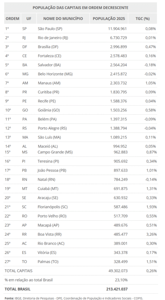 CIDADES — De acordo com o levantamento, 27 capitais estaduais concentraram 49,3 milhões de habitantes em 2025, o equivalente a quase um quarto (23,1%) da população total do país. O crescimento populacional das capitais com mais de um milhão de habitantes ficou abaixo de 1%, com exceção de Manaus (AM), que cresceu 1,05%.