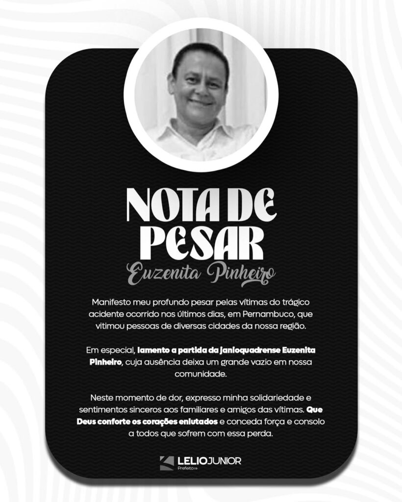 “Manifestamos, nossos sentimentos à família da janioquadrense Euzenita Pinheiro, cuja partida deixa um imenso vazio em nossa comunidade. Que Deus, em sua infinita bondade, conforte os corações enlutados e conceda força a todos que enfrentam este momento de dor”, diz o comunicado oficial.