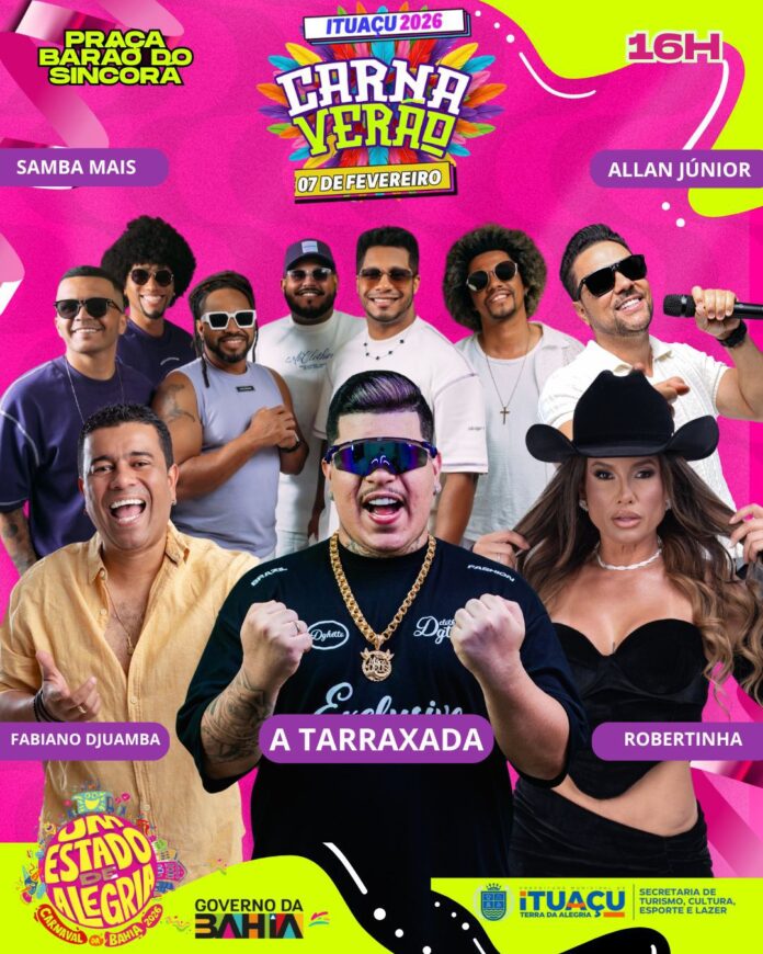 A Prefeitura de Ituaçu, por meio da Secretaria Municipal de Turismo, Cultura, Esporte e Lazer, anunciou que o Carnaverão será realizado no dia 7 de fevereiro, a partir das 16h. O evento contará com apresentações de Samba Mais, Allan Júnior, Fabiano Djuamba, A Tarraxada e Robertinha.