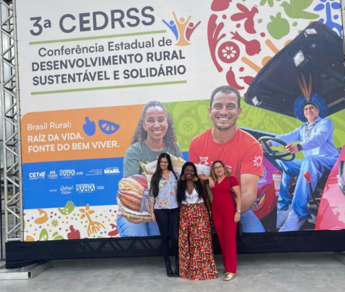 Representando a gestão municipal de Caraíbas, no sudoeste da Bahia, e a sociedade civil do município, Luciene Gomes, Jesuina Santos Dias e Camila Viana Bahiano participaram da 3ª Conferência Estadual de Desenvolvimento Rural Sustentável e Solidário (CEDRSS).