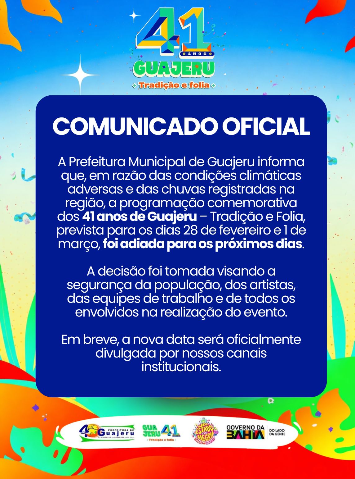 As fortes chuvas que atingiram a região nos últimos dias levaram a Prefeitura de Guajeru a adiar a programação comemorativa dos 41 anos do município, conhecida como Guajeru – Tradição e Folia, que estava prevista para os dias 28 de fevereiro e 1º de março.