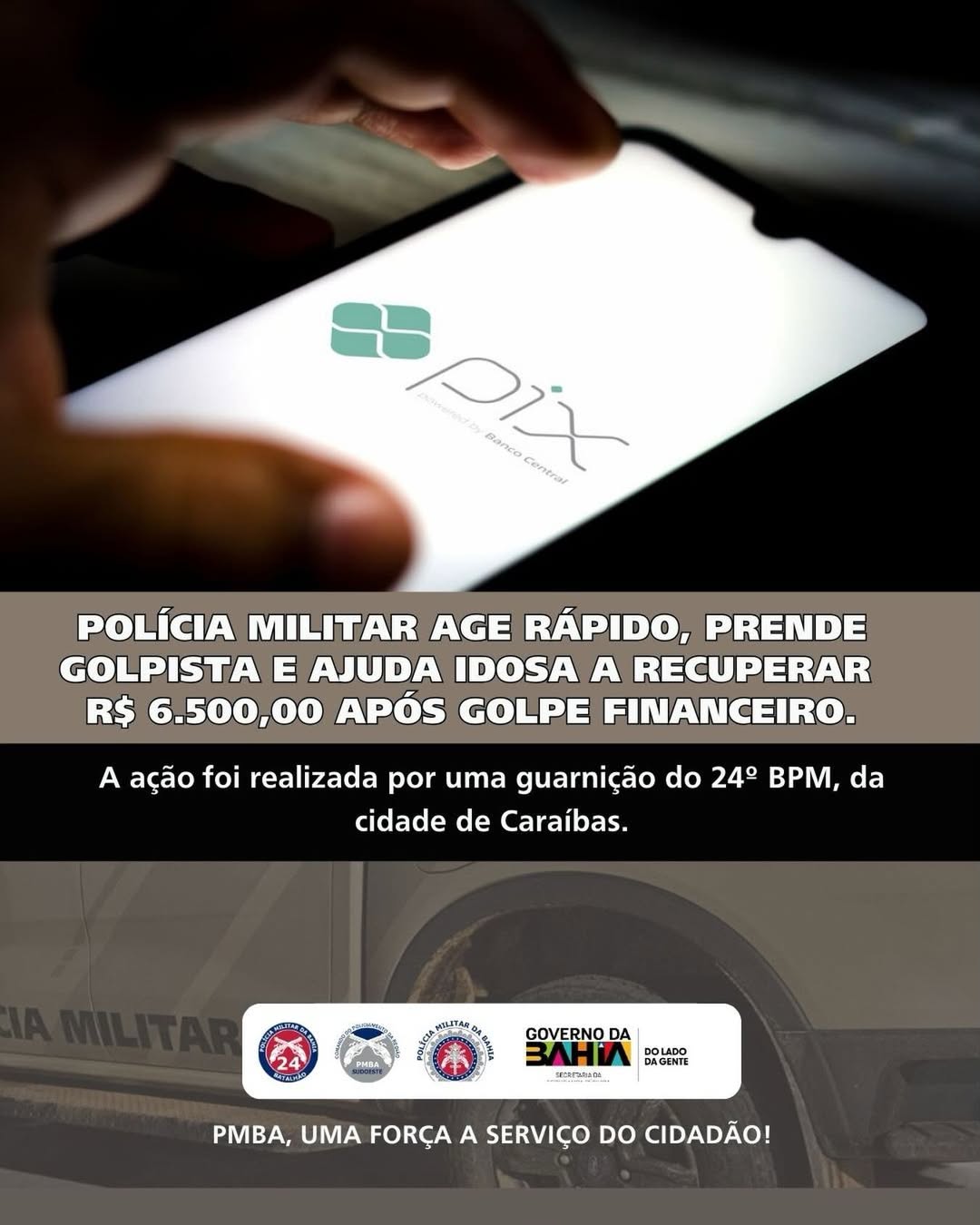 Uma ação rápida da Polícia Militar resultou na recuperação de R$ 6.500,00 (seis mil e quinhentos reais) subtraídos de uma idosa na última quinta-feira (27), no município de Caraíbas. O crime foi praticado por falsos vendedores de produtos ortopédicos, que realizaram um empréstimo indevido no nome da vítima e transferiram o valor via Pix.