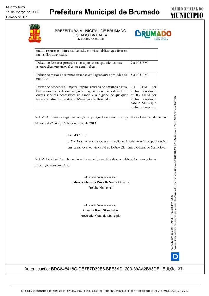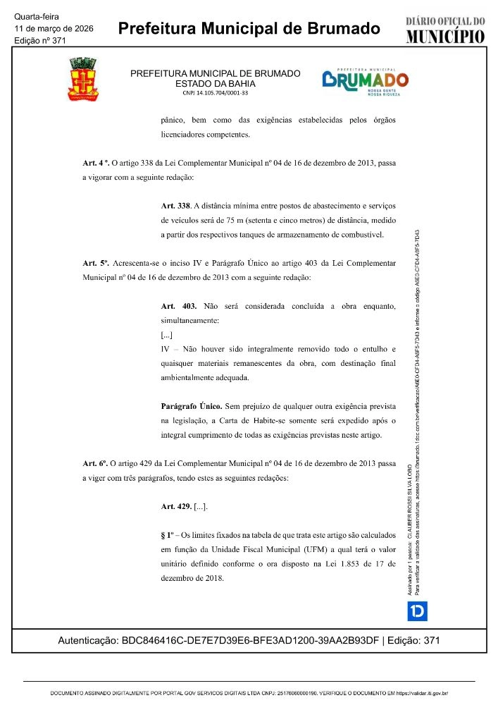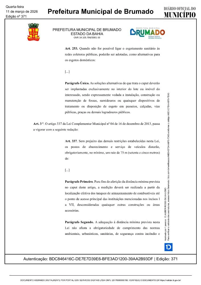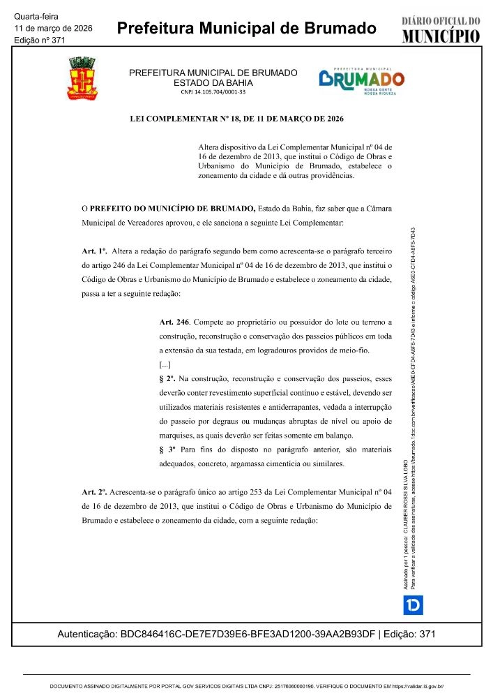 Foi publicada no Diário Oficial do Município de Brumado, nesta terça-feira (11), a Lei Complementar nº 18, que altera dispositivos da Lei Complementar Municipal nº 04, de 16 de dezembro de 2013, responsável por instituir o Código de Obras e Urbanismo do município, além de estabelecer o zoneamento da cidade e outras diretrizes para o ordenamento urbano.