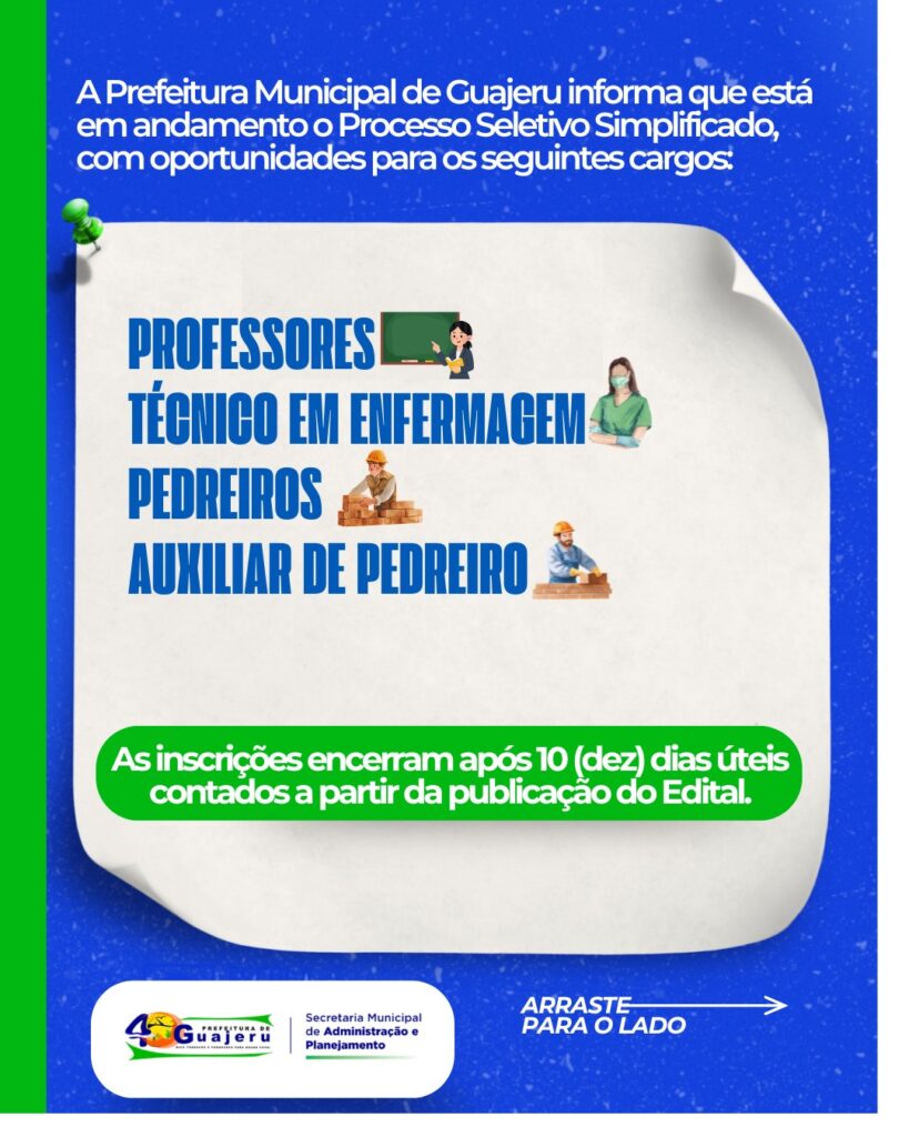 A Prefeitura Municipal de Guajeru divulgou o Edital nº 001/2026, referente ao Processo Administrativo nº 027/2026, que trata da abertura de um Processo Seletivo Simplificado para contratação de profissionais em diferentes áreas.