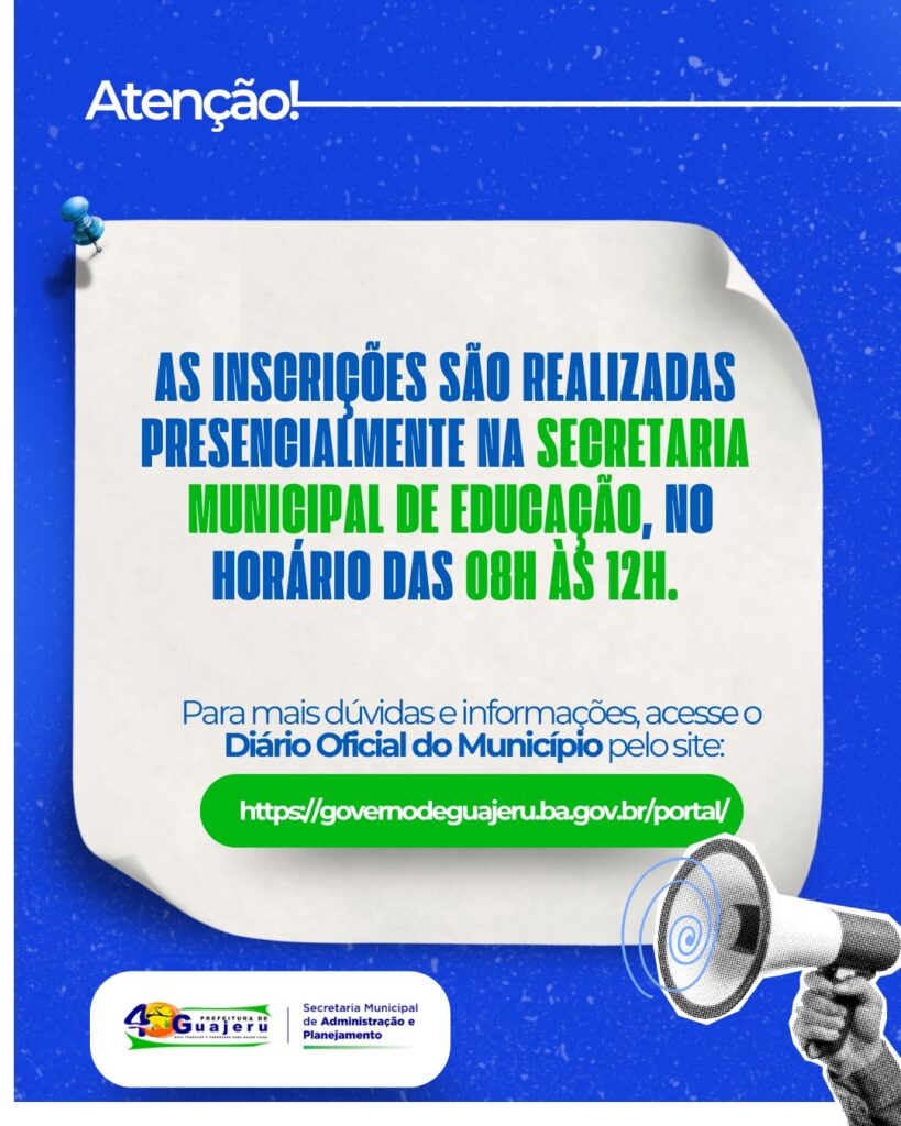 As inscrições devem ser realizadas presencialmente na Secretaria Municipal de Educação, no horário das 08h às 12h. A Prefeitura alerta que o prazo para inscrição é limitado: os interessados têm até 10 dias úteis, contados a partir da data de publicação do edital, para garantir participação no processo.