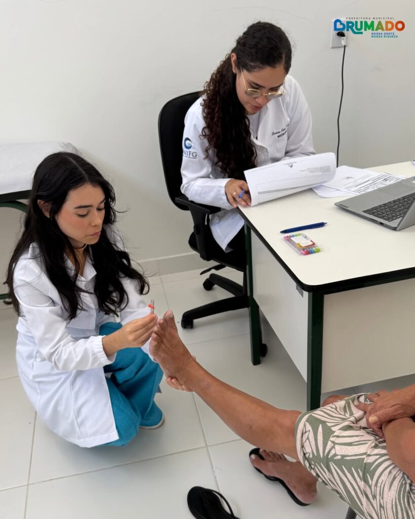 Durante a ação, foram oferecidos diversos serviços essenciais, como exames e avaliação dos pés, palestra educativa sobre cuidados preventivos, aferição de sinais vitais, verificação de medidas antropométricas, além da renovação de receitas médicas e atendimentos odontológicos.